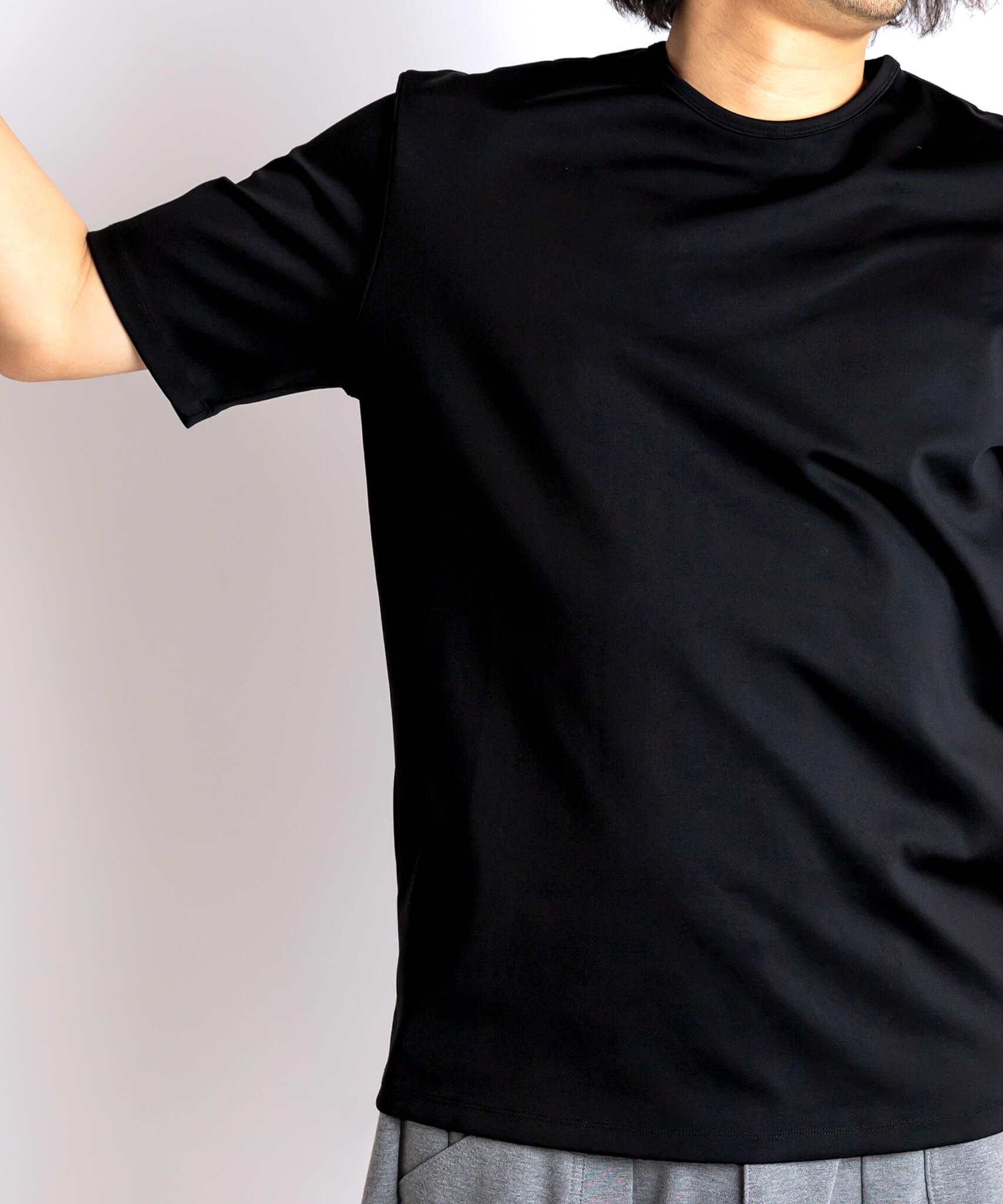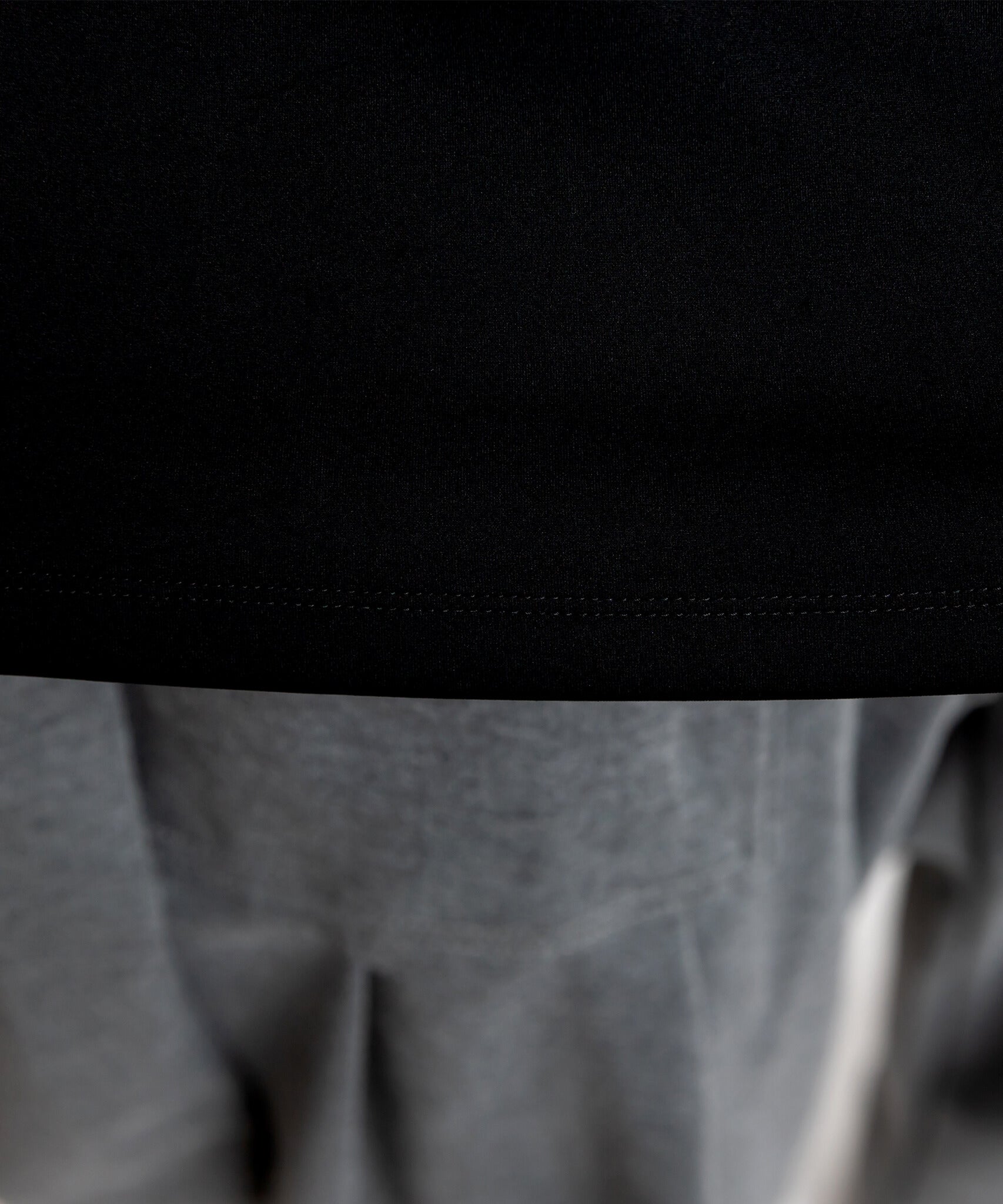 着心地の良さと綺麗め感を出したCovのベースとなるスタンダードボックス型のラグジュアリー魅せ黒Tシャツ。